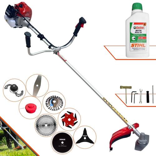 Roçadeira À Gasolina Kawashima BCJ 620L 62CC 3HP 2T + Faca 3 Pontas Duraline 255mm + Faca 40 Dentes Duraline 255mm + Faca 80 Dentes Duraline 255mm + Faca 6 Pontas 250mm + Escova Rotativa 24 cerdas + Trimmer + Óleo Castrol Stihl 2T 500ml