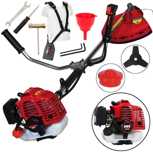 Acompanha carretel de fio de nylon, dosador de combustível, funil com peneira, ferramentas e cinto de sustentação luxo com 4 pontas, alças com apoio acolchoado e protetor lateral acolchoado.