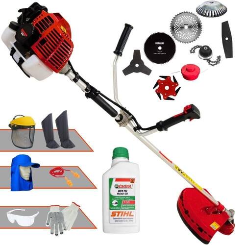 Roçadeira Profissional Lateral Kawashima KW43-L À Gasolina 2T 43cc 1,7HP Com Lâmina 3 Pontas + Faca 2 Pontas 330mm + Faca 40 Dentes 255mm + Faca 80 Dentes 255mm + Faca 6 Pontas 250mm + Escova 38 Cerdas + Trimmer + Óleo Castrol Stihl 500ml 2 Tempos + Kit EPI Completo
