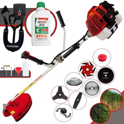 Roçadeira Profissional Lateral Kawashima KW43-L À Gasolina 2T 43cc 1,7HP Com Lâmina 3 Pontas + Faca 2 Pontas 330mm + Faca 40 Dentes 255mm + Faca 80 Dentes 255mm + Faca 6 Pontas 250mm + Escova 38 Cerdas + Trimmer + Óleo Castrol Stihl 500ml 2 Tempos