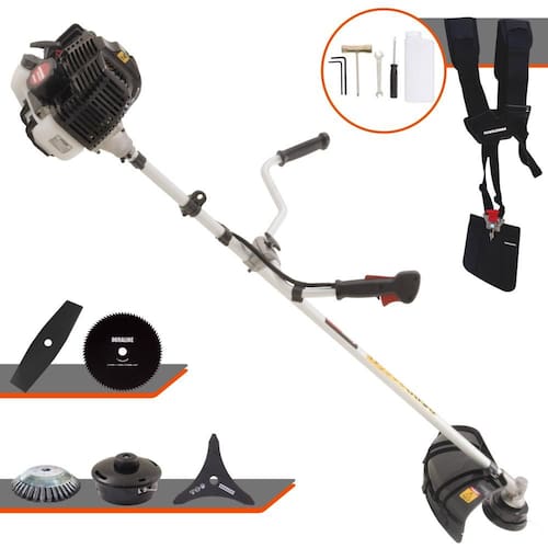 Roçadeira Kawashima KW43-LE À Gasolina 2T 43cc 1,7HP Com Lâmina 3 Pontas + Faca 2 Pontas 330mm 2,7mm + Faca 80 Dentes 255mm 1,5mm + Escova Rotativa 38 Cerdas 200mm