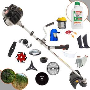 Roçadeira Kawashima KW43-LE À Gasolina 2T 43cc 1,7HP Com Lâmina 3 Pontas + Faca 2 Pontas + Faca 40 Dentes + Faca 80 Dentes + Faca 6 Pontas + Escova Rotativa 38 Cerdas + Trimmer + ÓLEO CASTROL STIHL 500ml 2 Tempos + Kit EPI Completo
