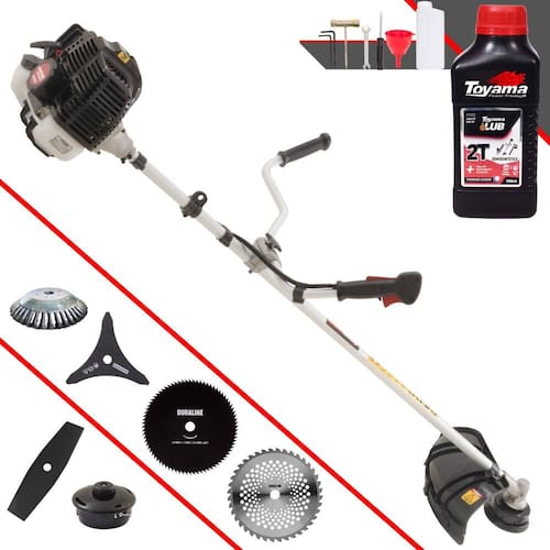 Roçadeira Kawashima KW52LE À Gasolina 2T 52c 2,5HP Com Lâmina 3 Pontas + Faca 2 Pontas 330mm 2,7mm + Faca 40 Dentes 255mm 2mm + Faca 80 Dentes 255mm 1,5mm + Escova Rotativa 38 Cerdas 200mm + Óleo TOYAMA LUB FG50 500ml 2T