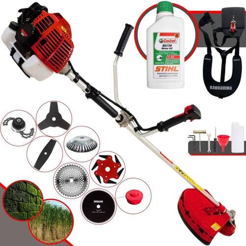 Roçadeira Profissional Lateral Kawashima KW52-L À Gasolina 2T 52c 2,5HP Com Lâmina 3 Pontas + Faca 2 Pontas 330mm + Faca 40 Dentes 255mm + Faca 80 Dentes 255mm + Faca 6 Pontas 250mm + Escova Rotativa 38 Cerdas 200mm + Trimmer + Óleo Castrol Stihl 500ml 2 Tempos