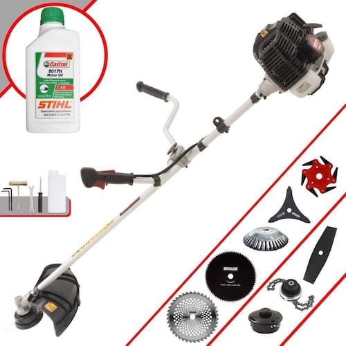 Roçadeira Profissional Kawashima KW52-LE À Gasolina 2T 52cc 2,5HP Com Lâmina 3 Pontas + Faca 2 Pontas + Faca 40 Dentes + Faca 80 Dentes + Faca 6 Pontas + Escova Rotativa 38 Cerdas + Trimmer + Óleo Castrol Stihl 500ml 2 Tempos