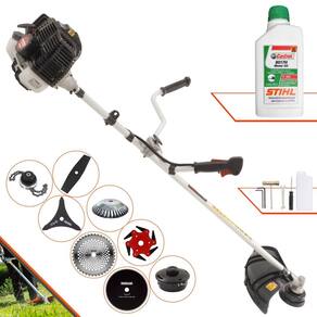 Roçadeira Kawashima KW52-LE À Gasolina 2T 52cc 2,5HP Com Lâmina 3 Pontas + Faca 2 Pontas + Faca 40 Dentes + Faca 80 Dentes + Faca 6 Pontas + Escova Rotativa 38 Cerdas + Trimmer + Óleo Castrol Stihl 500ml 2 Tempos