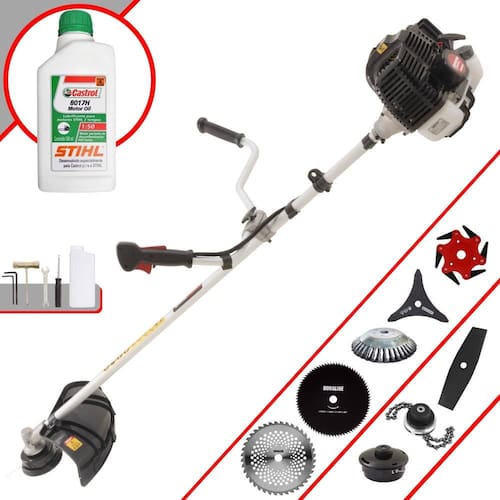 Roçadeira Kawashima KW52-LE À Gasolina 2T 52cc 2,5HP Com Lâmina 3 Pontas + Faca 2 Pontas + Faca 40 Dentes + Faca 80 Dentes + Faca 6 Pontas + Escova Rotativa 38 Cerdas + Trimmer + Óleo Castrol Stihl 500ml 2 Tempos