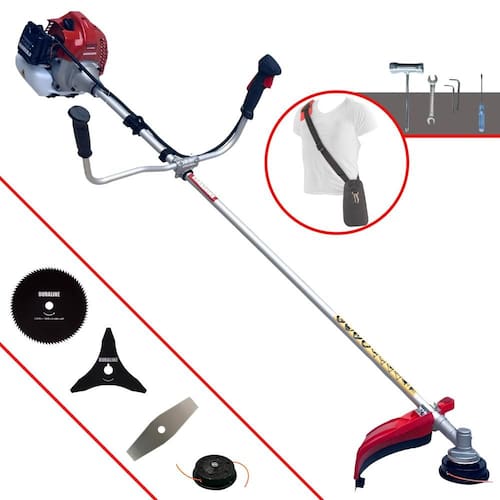 Com guidão ergonômico lateral, permite um alcance amplo e maior mobilidade, capaz de aumentar a produtividade diária. Possui motor 2 tempos á gasolina, de 43 Cilindradas; 1,7HP de potência que proporcionam maior performance e economia na operação. Seu conjunto de acessórios inclui kit de ferramentas, cinto de suporte almofadado, carretel de nylon e lâmina de corte 3 pontas.