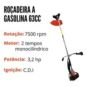 Especificações do produto: - Cilindrada: 63CC; - Modelo: IWRG2T63; - Motor: 2 tempos monocilíndrico; - Refrigerado a ar; - Rotação: 7500 rpm; - Ignição: CDI; - Capacidade do tanque de gasolina: 1,2L; - Proporção de mistura de óleo: 25:1; - 2 opções de corte: fio de nylon e lâmina 3 pontos; - Potência: 1,65kW / 2,2hp; - Autonomia 30 minutos; - Diâmetro da haste 26mm; - Carburador tipo diafragma; - Peso: 8,4kg;