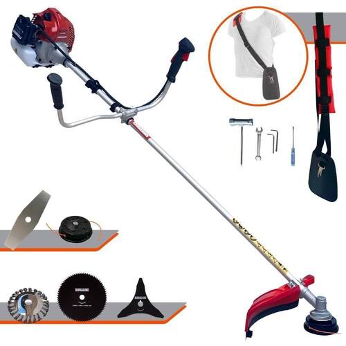 Com guidão ergonômico lateral, permite um alcance amplo e maior mobilidade, capaz de aumentar a produtividade diária. Possui motor 2 tempos á gasolina, de 52 Cilindradas; 2,5HP de potência que proporcionam maior performance e economia na operação. Seu conjunto de acessórios inclui kit de ferramentas, cinto de suporte almofadado, carretel de nylon e lâmina de corte 3 pontas.