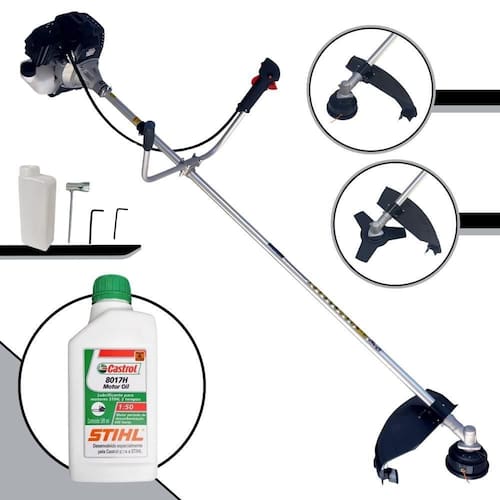 Com guidão ergonômico lateral, permite um alcance amplo e maior mobilidade, capaz de aumentar a produtividade diária. Possui motor 2 tempos á gasolina, de 43 Cilindradas, 10.000 de rotação 1,7HP de potência que proporcionam maior performance e economia na operação. Seu conjunto de acessórios inclui kit de ferramentas, cinto de suporte duplo almofadado, carretel de nylon e lâmina de corte 3 pontas.