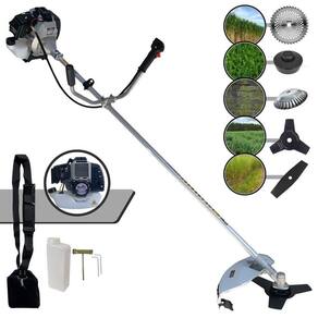Com guidão ergonômico lateral, permite um alcance amplo e maior mobilidade, capaz de aumentar a produtividade diária. Possui motor 2 tempos á gasolina, de 42,7 Cilindradas, 12.000 de rotação 1,7HP de potência que proporcionam maior performance e economia na operação. Seu conjunto de acessórios inclui kit de ferramentas, cinto de suporte almofadado, carretel de nylon e lâmina de corte 3 pontas.