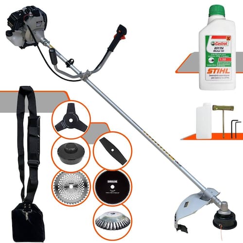 Com guidão ergonômico lateral, permite um alcance amplo e maior mobilidade, capaz de aumentar a produtividade diária. Possui motor 2 tempos á gasolina, de 42,7 Cilindradas, 12.000 de rotação 1,7HP de potência que proporcionam maior performance e economia na operação. Seu conjunto de acessórios inclui kit de ferramentas, cinto de suporte almofadado, carretel de nylon e lâmina de corte 3 pontas.