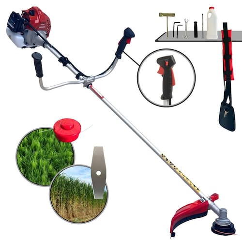 Com guidão ergonômico lateral, permite um alcance amplo e maior mobilidade, capaz de aumentar a produtividade diária. Possui motor 2 tempos á gasolina, de 62 Cilindradas; 3HP de potência que proporcionam maior performance e economia na operação. Seu conjunto de acessórios inclui kit de ferramentas, cinto de suporte almofadado, carretel de nylon e lâmina de corte 3 pontas.