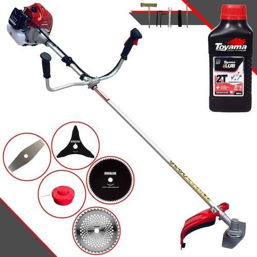 Roçadeira À Gasolina Kawashima BCJ 620L 62CC 3HP 2T + Faca 3 Pontas Duraline 255mm + Faca 40 Dentes Duraline 255mm + Faca 80 Dentes Duraline 255mm + Óleo Toyama FG50 500ml