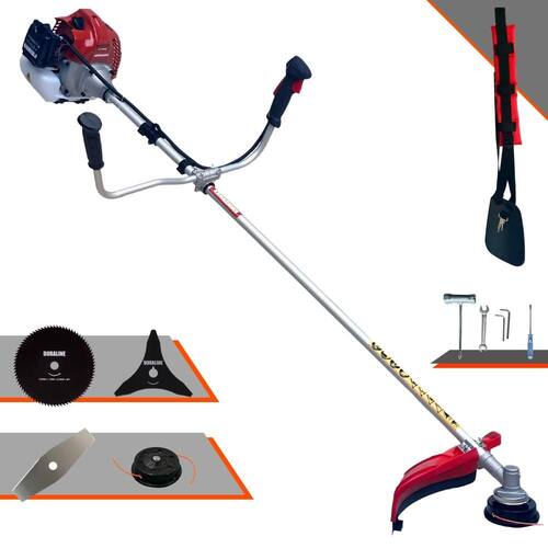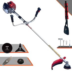 Com guidão ergonômico lateral, permite um alcance amplo e maior mobilidade, capaz de aumentar a produtividade diária. Possui motor 2 tempos á gasolina, de 43 Cilindradas; 1,7HP de potência que proporcionam maior performance e economia na operação. Seu conjunto de acessórios inclui kit de ferramentas, cinto de suporte almofadado, carretel de nylon e lâmina de corte 3 pontas.
