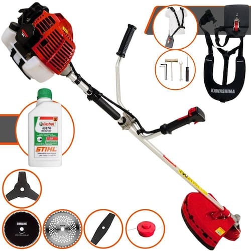 Roçadeira Profissional Lateral Kawashima KW52-L À Gasolina 2T 52c 2,5HP Com Lâmina 3 Pontas + Faca 2 Pontas 330mm + Faca 40 Dentes 255mm + Faca 80 Dentes 255mm + Óleo CASTROL STIHL 500ml
