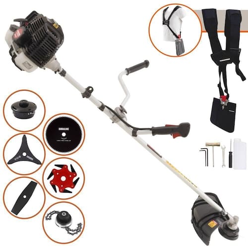 Roçadeira Profissional Kawashima KW43-LE À Gasolina 2T 43cc 1,7HP Com Lâmina 3 Pontas + Faca 2 Pontas 330mm 2,7mm + Faca 80 Dentes 255mm 1,5mm + Trimmer + Faca 6 Pontas 250mm