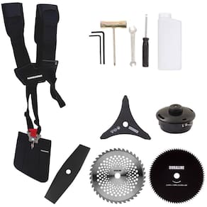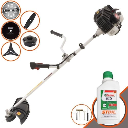 Roçadeira Profissional Kawashima KW43-LE À Gasolina 2T 43cc 1,7HP Com Lâmina 3 Pontas + Faca 2 Pontas 330mm 2,7mm+ Faca 40 Dentes 255mm 2mm + Faca 80 Dentes 255mm 1,5mm + Óleo CASTROL STIHL 500ml 2 Tempos