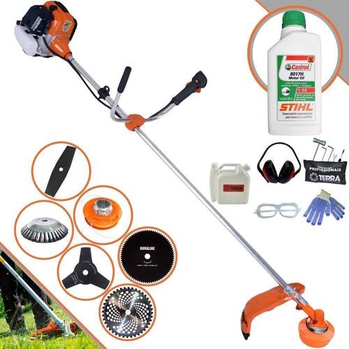 Roçadeira Profissional Lateral Terra GR520XP À Gasolina 2 Tempos 52cc 2,5HP Com Lâmina 40 Dentes + Faca 2 Pontas 330mm + Faca 3 Pontas 255mm + Faca 80 Dentes 255mm + Escova Rotativa 38 Cerdas + Óleo Castrol Stihl 500ml