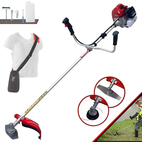 Com guidão ergonômico lateral, permite um alcance amplo e maior mobilidade, capaz de aumentar a produtividade diária. Possui motor 2 tempos á gasolina, de 43 Cilindradas; 1,7HP de potência que proporcionam maior performance e economia na operação. Seu conjunto de acessórios inclui kit de ferramentas, cinto de suporte almofadado, carretel de nylon e lâmina de corte 3 pontas.