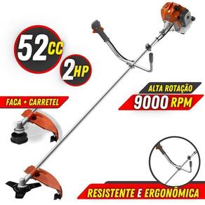 Com guidão ergonômico lateral, permite um alcance amplo e maior mobilidade, capaz de aumentar a produtividade diária. Com motor 2 tempos á gasolina, de 51,6 Cilindradas (52cc) e 2,0 de potência que proporcionam grande qualidade no corte. Seu conjunto de acessórios inclui kit de ferramentas, cinto de suporte duplo almofadado, carretel de nylon e lâmina de corte 3 pontas.
