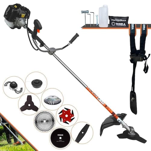 Roçadeira Profissional Lateral Terra GRH-430 Black À Gasolina 2 Tempos 43cc 1,7HP + Faca 2 Pontas 330mm 2,7mm + Faca 40 Dentes 255mm 2mm + Faca 80 Dentes 255mm 1,5mm + Faca 6 Pontas 250mm + Escova Rotativa 200mm 38 Cerdas + Trimmer