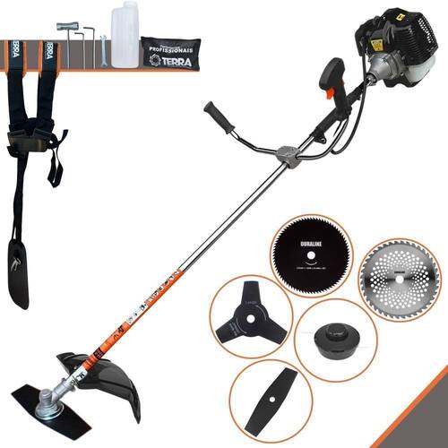 Roçadeira Profissional Lateral Terra GRH-520 Black À Gasolina 2 Tempos 52cc 2,5HP + Faca 3 Pontas 255mm 2,9mm + Faca 40 Pontas 255mm 2mm + Faca 80 Pontas 255mm 1,5mm
