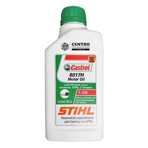 Operador, instrução de mistura recomendada para a utilização da máquina com o Óleo 2T CASTROL STIHL (1:50) 500ml : Observe sempre a proporção da mistura específica deste óleo, onde para cada 1 Litro de Gasolina utilizar 20ml do Óleo CASTROL STIHL, ou para cada 500ml de Gasolina utilizar 10ml do Óleo CASTROL STIHL. Além de manter o bom funcionamento, você pode prevenir futuras falhas e excesso de fumaça no cilindro de combustão.
