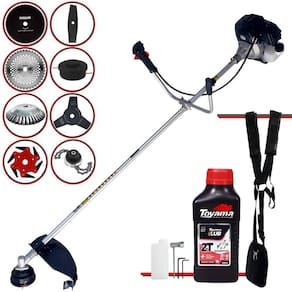 Roçadeira Profissional À Gasolina Toyama RT43L-B-25A 43cc 1,7HP 2T Com Lâmina 3 Pontas + Faca 2 Pontas 330mm + Faca 40 Dentes 255mm + Faca 80 Dentes 255mm + Faca 6 Pontas 250mm + Trimmer + Escova Rotativa 200mm 38 Cerdas + Óleo Toyama FG50 500ml
