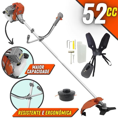 Com guidão ergonômico lateral, permite um alcance amplo e maior mobilidade, capaz de aumentar a produtividade diária. Possui motor 2 tempos á gasolina, de 51,6 Cilindradas (52cc) 13.000 de rotação 2,0 HP de potência que proporcionam maior performance e economia na operação. Seu conjunto de acessórios inclui kit de ferramentas, cinto de suporte duplo almofadado, carretel de nylon e lâmina de corte 3 pontas.