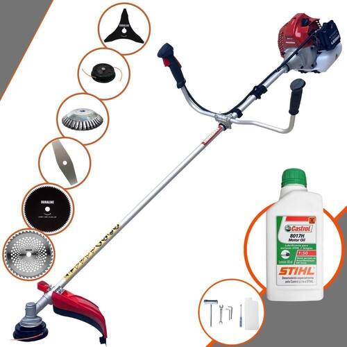 Roçadeira Profissional À Gasolina Kawashima BCJ 431L 42,7CC 1,7HP 2T + Faca 3 Pontas + Faca 40 Dentes + Faca 80 Dentes + Escova 38 Cerdas + Óleo Castrol Stihl 500ml