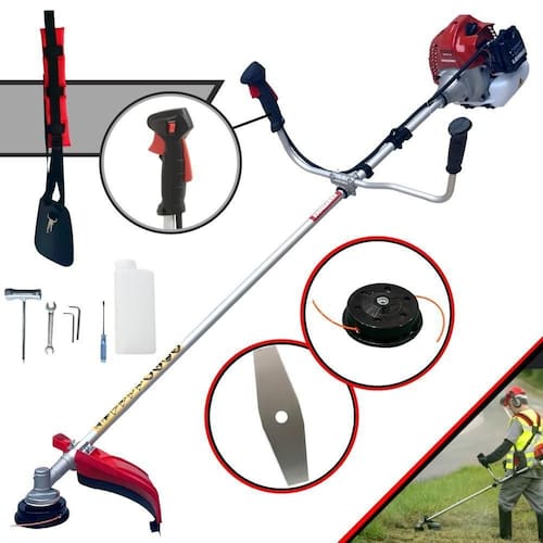 Com guidão ergonômico lateral, permite um alcance amplo e maior mobilidade, capaz de aumentar a produtividade diária. Possui motor 2 tempos á gasolina, de 52 Cilindradas; 2,5HP de potência que proporcionam maior performance e economia na operação. Seu conjunto de acessórios inclui kit de ferramentas, cinto de suporte almofadado, carretel de nylon e lâmina de corte 3 pontas.