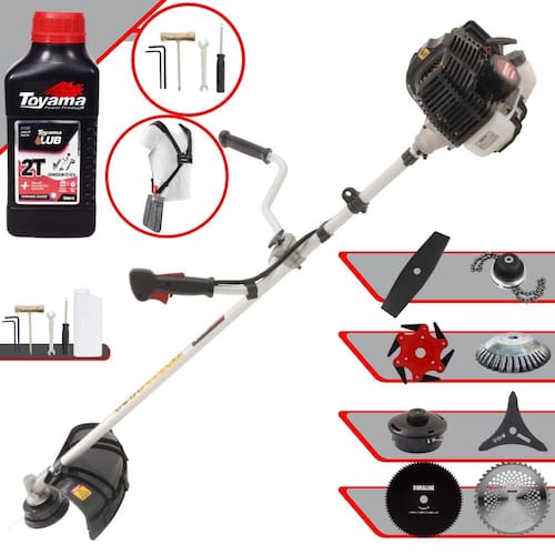 Roçadeira Kawashima KW43-LE À Gasolina 2T 43cc 1,7HP Com Lâmina 3 Pontas + Faca 2 Pontas + Faca 40 Dentes + Faca 80 Dentes + Faca 6 Pontas + Escova Rotativa 38 Cerdas + Trimmer + Óleo TOYAMA LUB FG50 500ml 2T