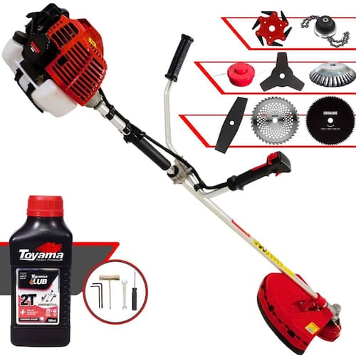 Roçadeira Lateral Kawashima KW52-L À Gasolina 2T 52c 2,5HP Com Lâmina 3 Pontas + Faca 2 Pontas 330mm + Faca 40 Dentes 255mm + Faca 80 Dentes 255mm + Faca 6 Pontas 250mm + Escova Rotativa 38 Cerdas 200mm + Trimmer + Óleo Toyama LUB FG50 500ml 2T