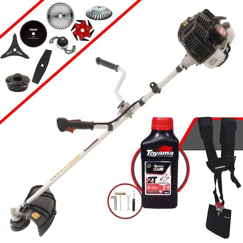 Roçadeira Kawashima KW52-LE À Gasolina 2T 52cc 2,5HP Com Lâmina 3 Pontas + Faca 2 Pontas + Faca 40 Dentes + Faca 80 Dentes + Faca 6 Pontas + Escova Rotativa 38 Cerdas + Trimmer + Óleo TOYAMA LUB FG50 500ml 2T