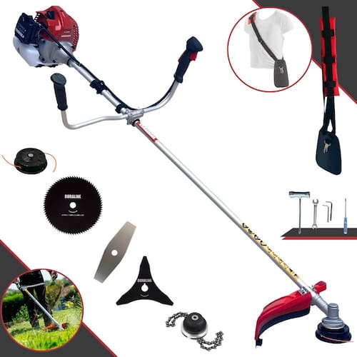 Com guidão ergonômico lateral, permite um alcance amplo e maior mobilidade, capaz de aumentar a produtividade diária. Possui motor 2 tempos á gasolina, de 52 Cilindradas; 2,5HP de potência que proporcionam maior performance e economia na operação. Seu conjunto de acessórios inclui kit de ferramentas, cinto de suporte almofadado, carretel de nylon e lâmina de corte 3 pontas.