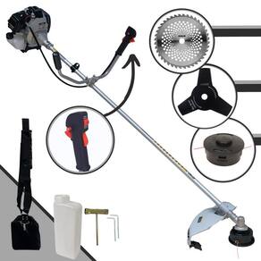Com guidão ergonômico lateral, permite um alcance amplo e maior mobilidade, capaz de aumentar a produtividade diária. Possui motor 2 tempos á gasolina, de 42,7 Cilindradas, 12.000 de rotação 1,7HP de potência que proporcionam maior performance e economia na operação. Seu conjunto de acessórios inclui kit de ferramentas, cinto de suporte almofadado, carretel de nylon e lâmina de corte 3 pontas.