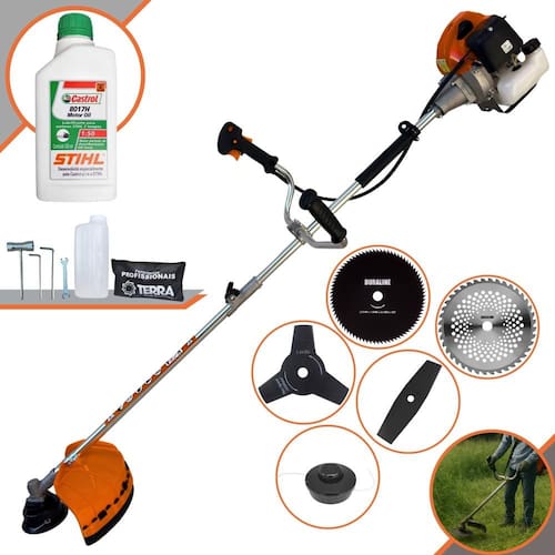 Roçadeira Robusta Terra GRHB430 Bi-Partida À Gasolina 43cc Com Carretel + Faca 2 Pontas + Faca 3 Pontas + Faca 40 Dentes + Faca 80 Dentes + ÓLEO STIHL
