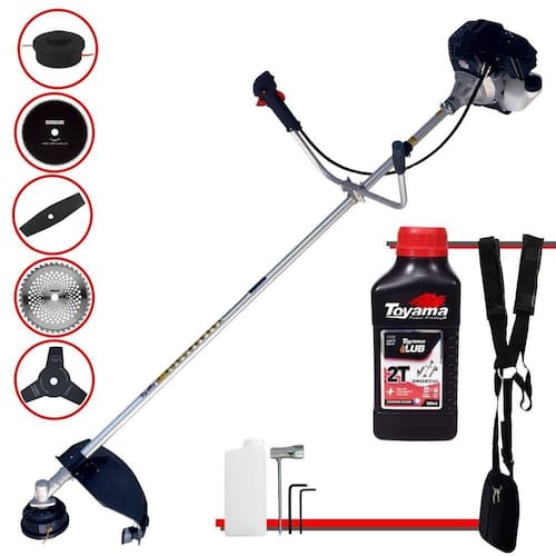 Roçadeira Profissional À Gasolina Toyama RT43L-B-25A 43cc 1,7HP 2T Com Lâmina 3 Pontas + Faca 2 Pontas 330mm + Faca 40 Dentes 255mm + Faca 80 Dentes 255mm + Óleo Toyama FG50 500ml