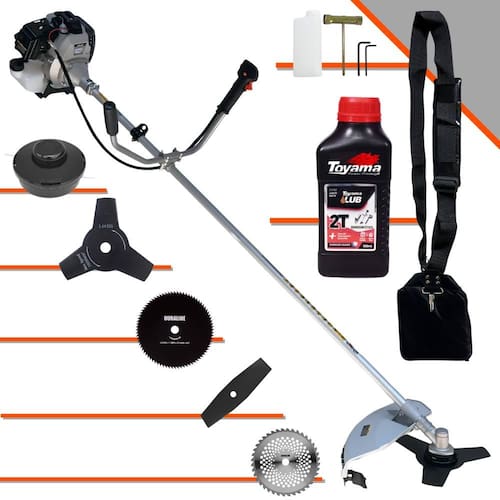 Roçadeira À Gasolina Toyama TBC43H 42,7cc 1,7HP 12.000rpm 2T + Faca 2 Pontas 330mm 2,7mm + Faca 40 Dentes 255mm 2mm + Faca 80 Dentes 255mm 2mm + Óleo Toyama FG50 500ml