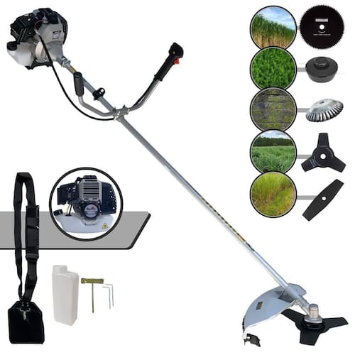 Com guidão ergonômico lateral, permite um alcance amplo e maior mobilidade, capaz de aumentar a produtividade diária. Possui motor 2 tempos á gasolina, de 42,7 Cilindradas, 12.000 de rotação 1,7HP de potência que proporcionam maior performance e economia na operação. Seu conjunto de acessórios inclui kit de ferramentas, cinto de suporte almofadado, carretel de nylon e lâmina de corte 3 pontas.