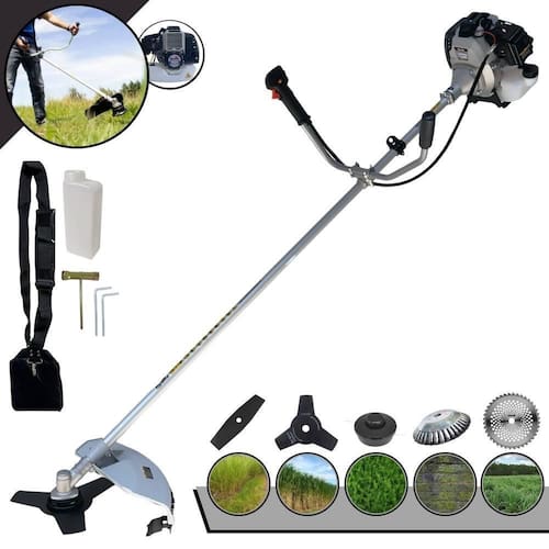 Com guidão ergonômico lateral, permite um alcance amplo e maior mobilidade, capaz de aumentar a produtividade diária. Possui motor 2 tempos á gasolina, de 42,7 Cilindradas, 12.000 de rotação 1,7HP de potência que proporcionam maior performance e economia na operação. Seu conjunto de acessórios inclui kit de ferramentas, cinto de suporte almofadado, carretel de nylon e lâmina de corte 3 pontas.