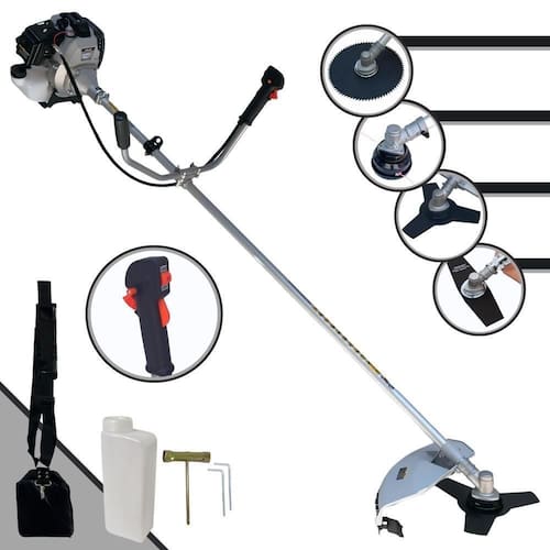 Com guidão ergonômico lateral, permite um alcance amplo e maior mobilidade, capaz de aumentar a produtividade diária. Possui motor 2 tempos á gasolina, de 42,7 Cilindradas, 12.000 de rotação 1,7HP de potência que proporcionam maior performance e economia na operação. Seu conjunto de acessórios inclui kit de ferramentas, cinto de suporte almofadado, carretel de nylon e lâmina de corte 3 pontas.