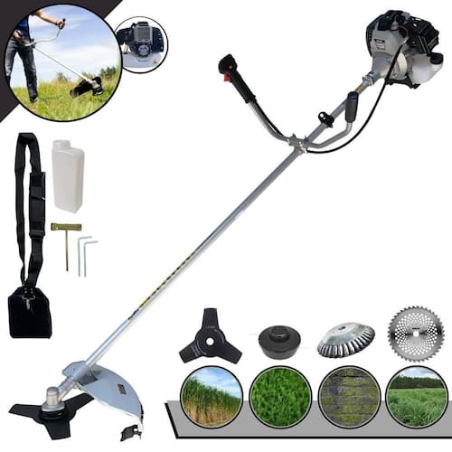 Com guidão ergonômico lateral, permite um alcance amplo e maior mobilidade, capaz de aumentar a produtividade diária. Possui motor 2 tempos á gasolina, de 42,7 Cilindradas, 12.000 de rotação 1,7HP de potência que proporcionam maior performance e economia na operação. Seu conjunto de acessórios inclui kit de ferramentas, cinto de suporte almofadado, carretel de nylon e lâmina de corte 3 pontas.