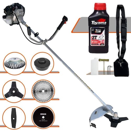 Roçadeira Profissional À Gasolina Toyama TBC43H 42,7cc 1,7HP 12.000rpm 2T + Faca 2 Pontas 330mm 2,7mm + Faca 40 Dentes 255mm 2mm + Faca 80 Dentes 255mm 1,5mm + Escova Rotativa 38 Cerdas 200mm + Óleo Toyama FG50 500ml