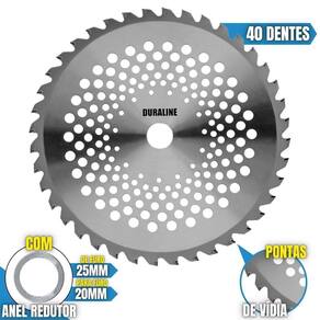 O DISCO DE CORTE Vídea acompanha um anel de redução, ou seja, pode ser utiizada para roçadeiras de furo 20mm ou 25mm além de possui pintura feita por Cataforese a qual é mais resistente à corrosão. Seus dentes de vídea soldados à laser possuem encaixe especial, garantindo mais , desempenho e durabilidade, as lâminas são balanceadas com menor vibração, corte contínuo e suave, com mais conforto ao operador e mais longevidade para a roçadeira. Possui maior rendimento no trabalho e não precisa ser afiada antes do uso, uma vez que possuem ponta 4 lados de polimero, solda de ponta tipo U. Ideal para terrenos com cascalhos e pequenos galhos para serrar.