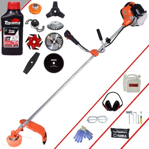 Roçadeira Terra GR520XP À Gasolina 2T 52cc 2,5HP Com Lâmina 40 Dentes + Faca 2 Pontas + Faca 3 Pontas + Faca 6 Pontas + Faca 80 Dentes + Escova 38C + Trimmer + Óleo TOYAMA FG50 500ml 2T