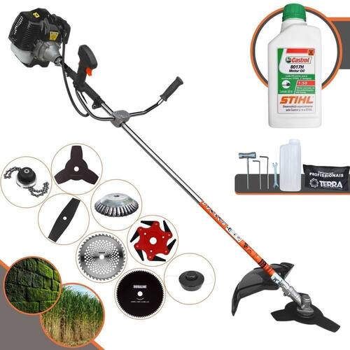 Roçadeira Profissional Lateral Terra GRH-430 Black À Gasolina 2 Tempos 43cc 1,7HP + Faca 2 Pontas 330mm 2,7mm + Faca 40 Dentes 255mm 2mm + Faca 80 Dentes 255mm 1,5mm + Faca 6 Pontas 250mm + Escova Rotativa 200mm 38 Cerdas + Trimmer + Óleo Castrol Stihl 2T 500ml