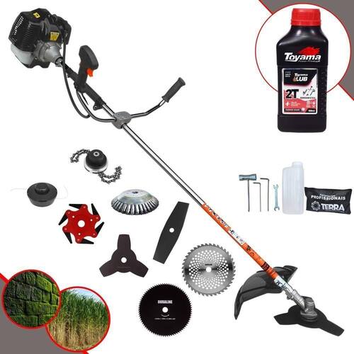 Roçadeira Profissional Lateral Terra GRH-430 Black À Gasolina 2 Tempos 43cc 1,7HP + Faca 2 Pontas 330mm 2,7mm + Faca 40 Dentes 255mm 2mm + Faca 80 Dentes 255mm 1,5mm + Faca 6 Pontas 250mm + Escova Rotativa 200mm 38 Cerdas + Trimmer + Óleo TOYAMA LUB FG50 500ml 2T